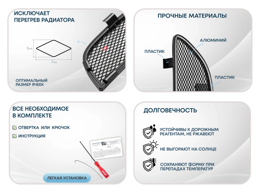Защитная сетка устанавливается поверх штатной решетки радиатора на пластиковые Г-образные защелки. Достаточно защелкнуть сетку в штатные отверстия решетки и зафиксировать её в посадочном месте. Отвертка помогает загнуть защёлки. Снятие штатной решетки и разбор бампера не требуются.