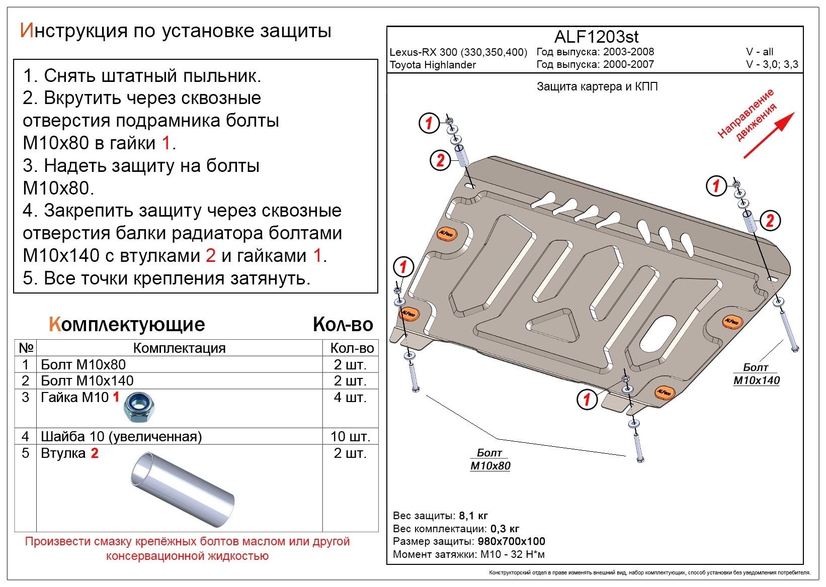 ALF1203ST Защита картера и КПП изготавливается из холоднокатаной стали марки Ст3СП ГОСТ и окрашивается европейской порошковой антикоррозийной краской (антикор). Это незаменимый, необходимый и надежный автоаксессуар, который поможет обеспечить сохранность двигателя, коробки передач (КПП), радиатора Вашего Lexus RX II Рестайлинг при наезде на бордюры, ямы, выступающие канализационные люки, кромки поврежденного асфальта, камней, при наезде на куски льда на заснеженной дороге, а также от попадания грязи, фрагментов растительности и других инородных тел. Защиты изготавливаются на оборонном заводе в Нижнем Тагиле.