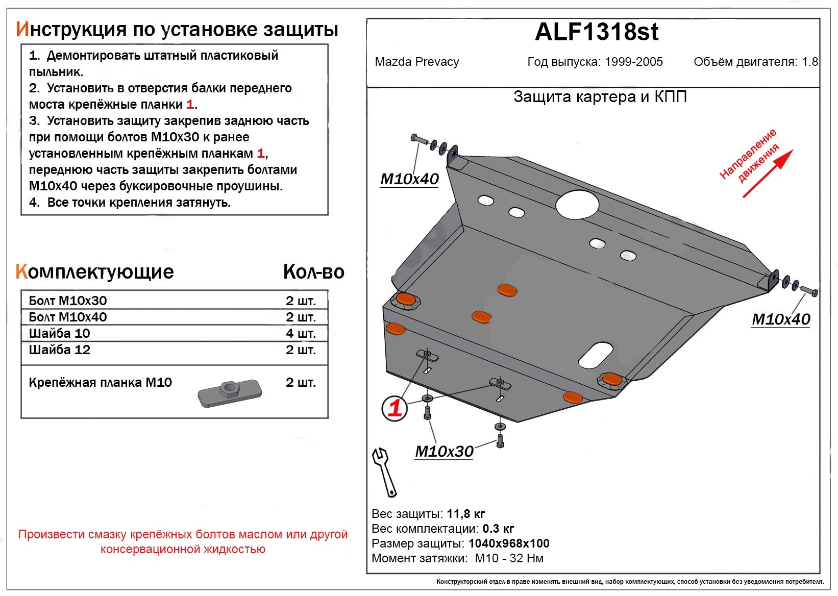 ALF1318ST Защита картера и КПП изготавливается из холоднокатаной стали марки Ст3СП ГОСТ и окрашивается европейской порошковой антикоррозийной краской (антикор). Это незаменимый, необходимый и надежный автоаксессуар, который поможет обеспечить сохранность двигателя, коробки передач (КПП), радиатора Вашего Mazda Premacy I (CP) при наезде на бордюры, ямы, выступающие канализационные люки, кромки поврежденного асфальта, камней, при наезде на куски льда на заснеженной дороге, а также от попадания грязи, фрагментов растительности и других инородных тел. Защиты изготавливаются на оборонном заводе в Нижнем Тагиле.