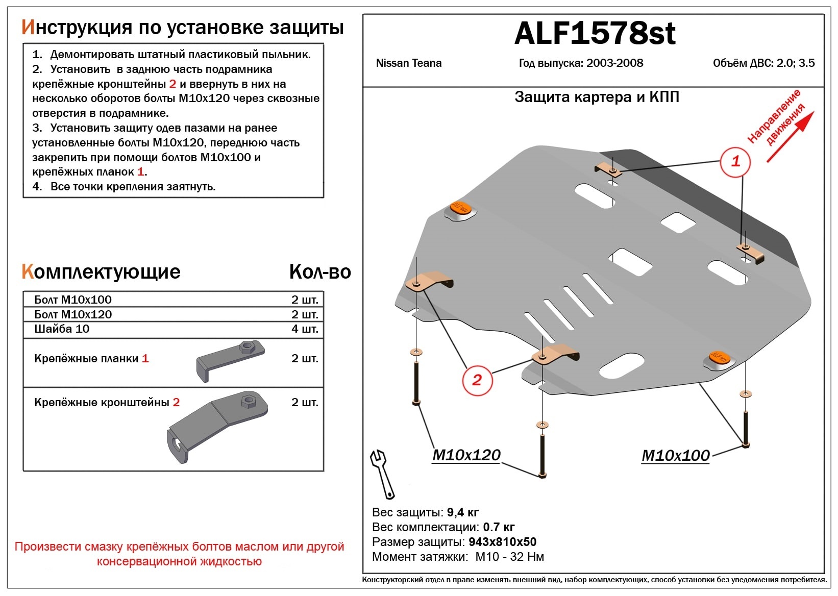 - Защита картера и КПП для Nissan Teana I Черный Alfeco ALF1578ST можно установить самостоятельно или на любом СТО без проблем.