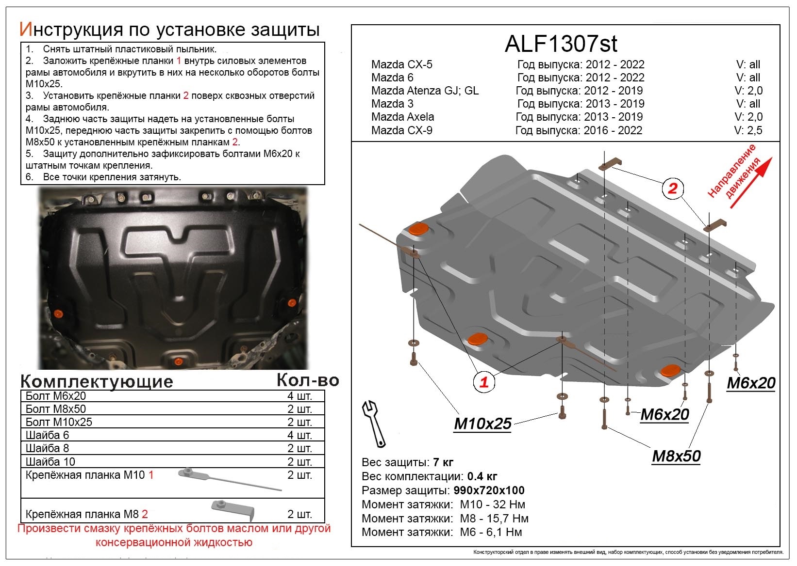 Особенности защит ALFeco: метод холодной штамповки на мощном прессовом оборудовании позволяет получить изделие жесткой конструкции, что в свою очередь улучшает его защитные качества. Дополнительные демпферные элементы поглощают вибрацию двигателя и позволяют плотнее прижимать защиту. Защита не уменьшает клиренс и сохраняет другие штатные параметры Вашего Mazda 6 III (GJ) .