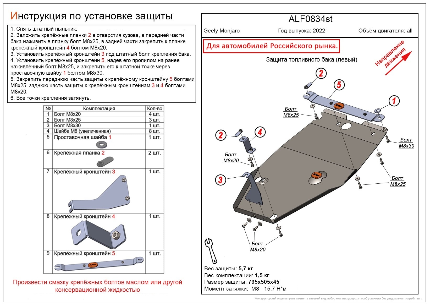 - Защита топливного бака (левая сторона) для Geely Monjaro Alfeco ALF0834st совместим и проверен на практике — установка без доработок.