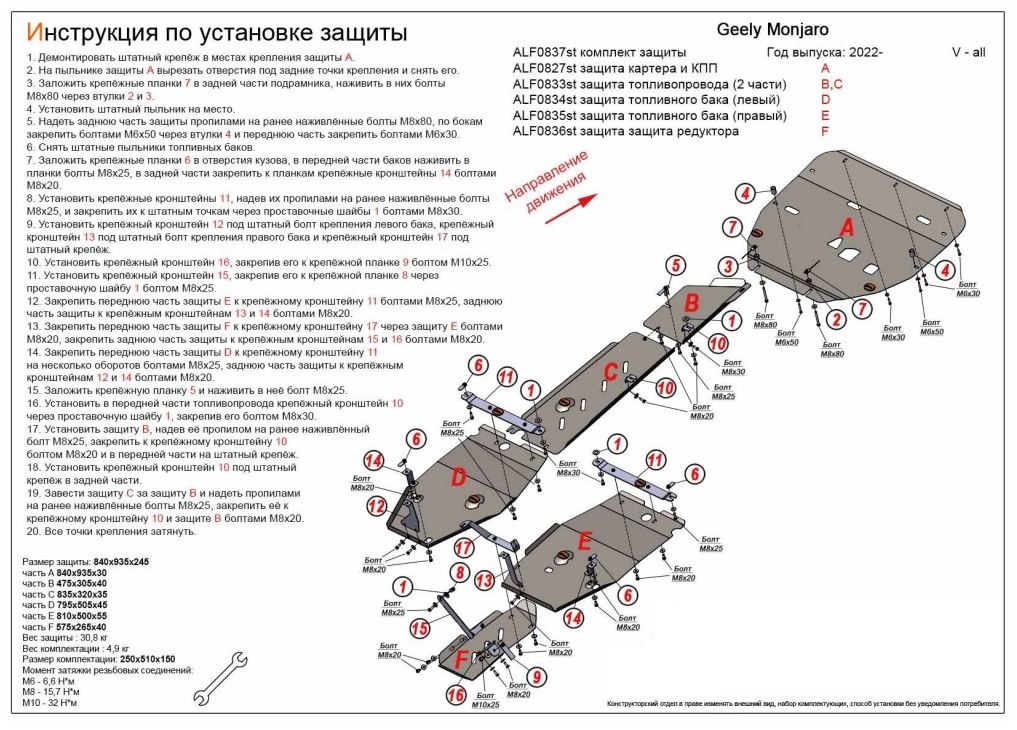 - Комплект защиты (картер, КПП, топливопровод, баки, редуктор (6 частей) для Geely Monjaro совместим и проверен на практике — установка без доработок.