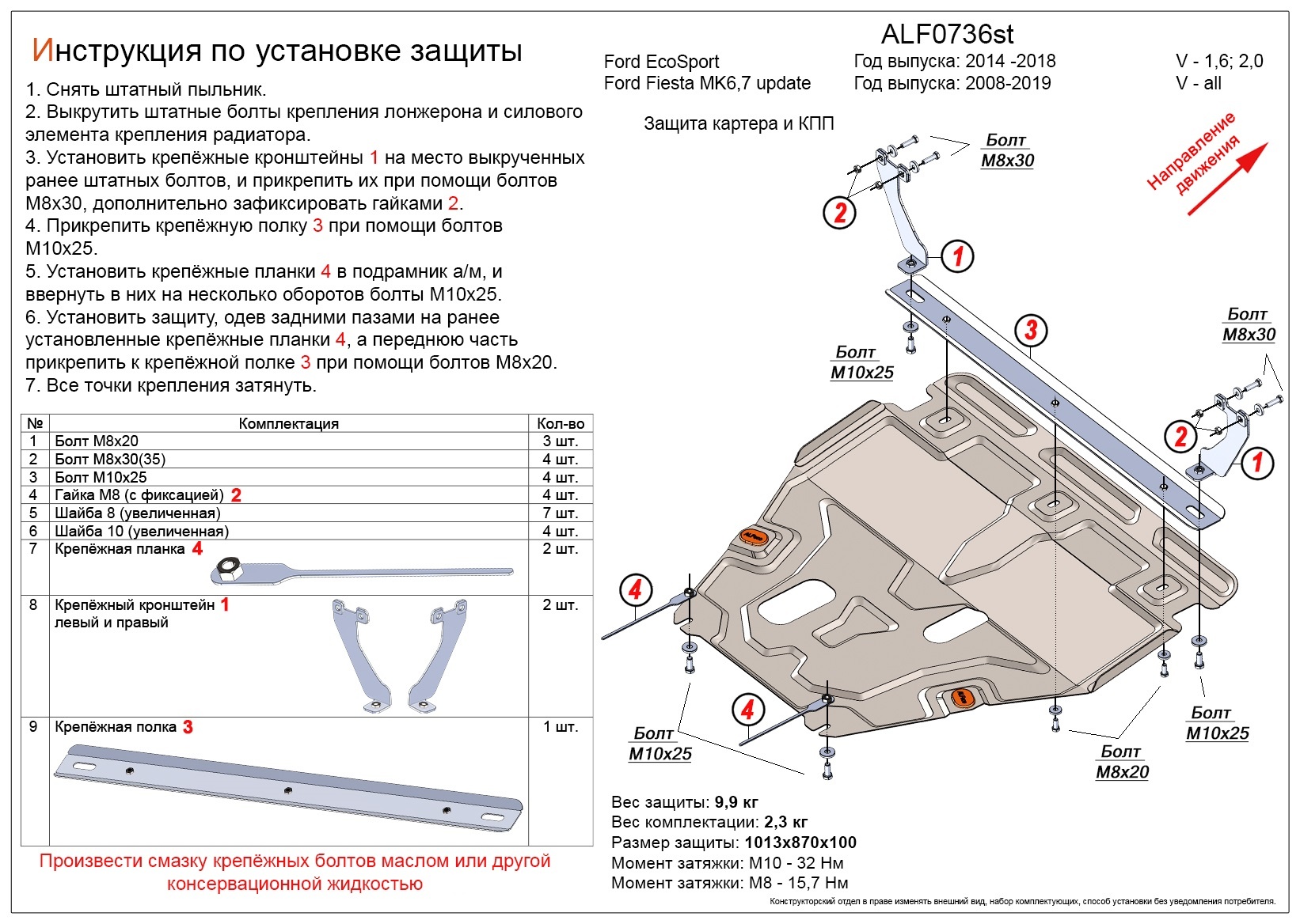 - Увеличенная защита картера и КПП для Ford Fiesta Mk6 Рестайлинг Alfeco ALF0736AL совместим и проверен на практике — установка без доработок.