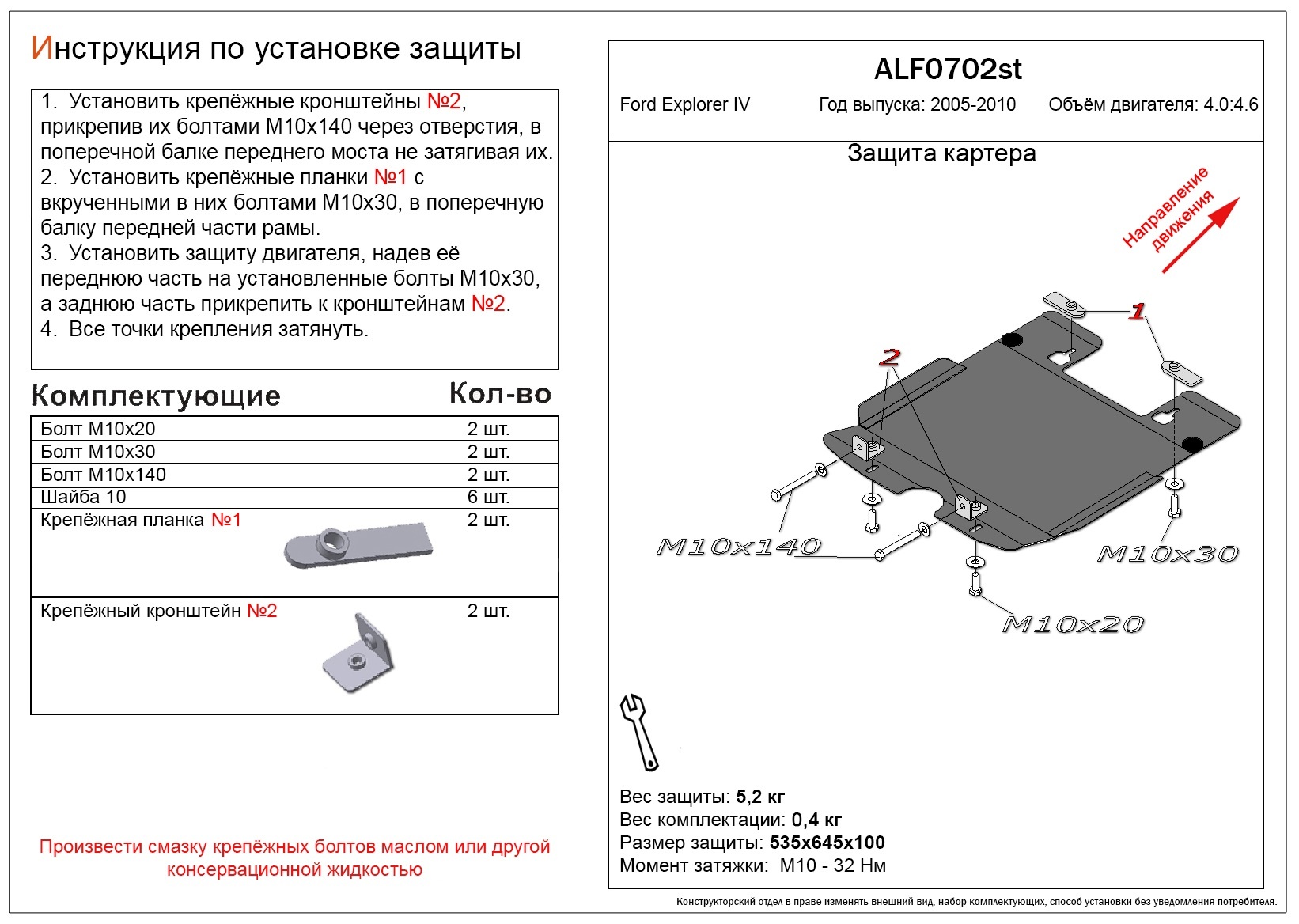 - Защита картера для Ford Explorer IV Alfeco ALF0702AL совместим и проверен на практике — установка без доработок.