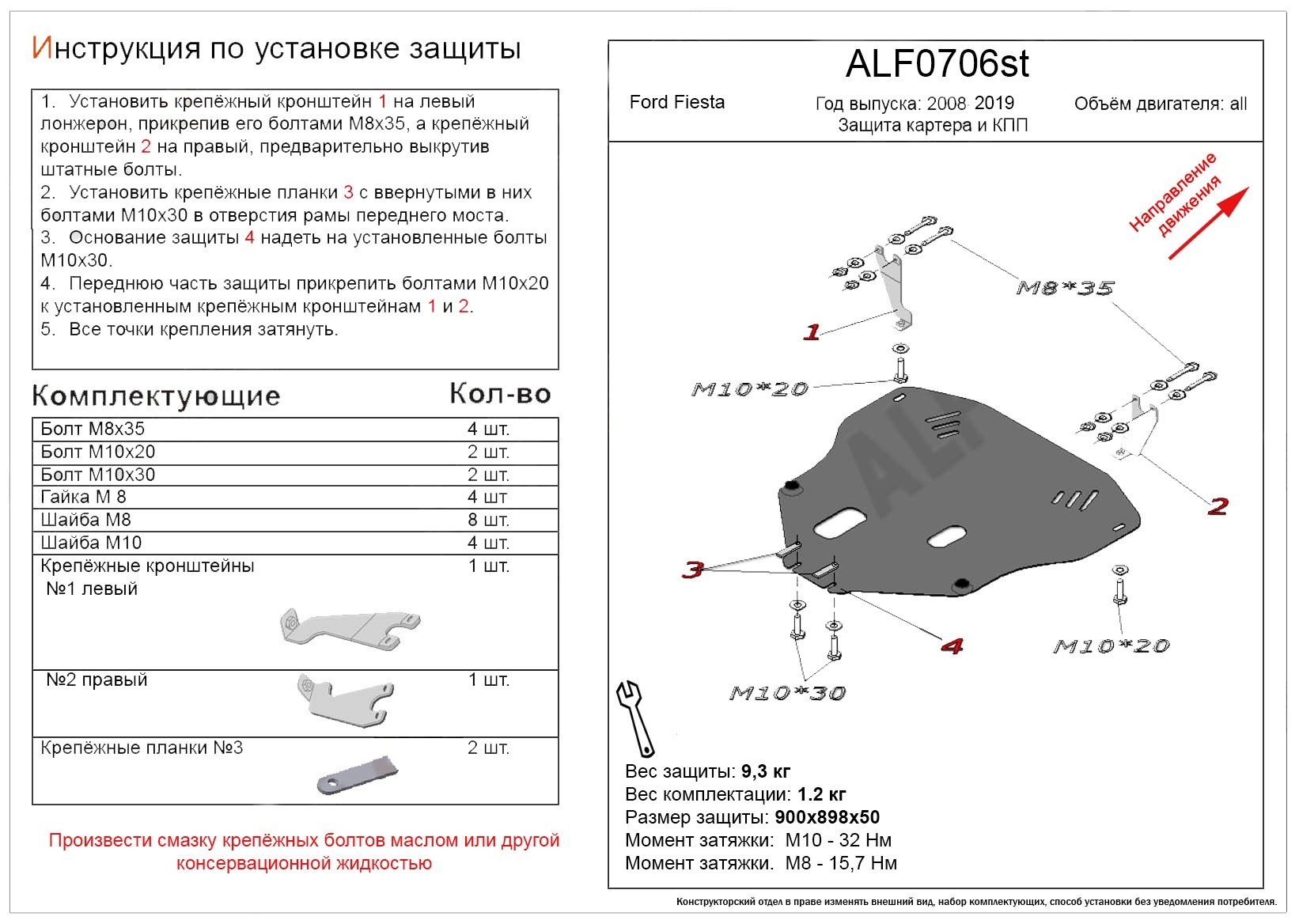 - Защита картера и КПП для Ford Fiesta Mk6 Alfeco ALF0706AL прошёл обязательную сертификацию — подходит для эксплуатации на дорогах общего пользования.