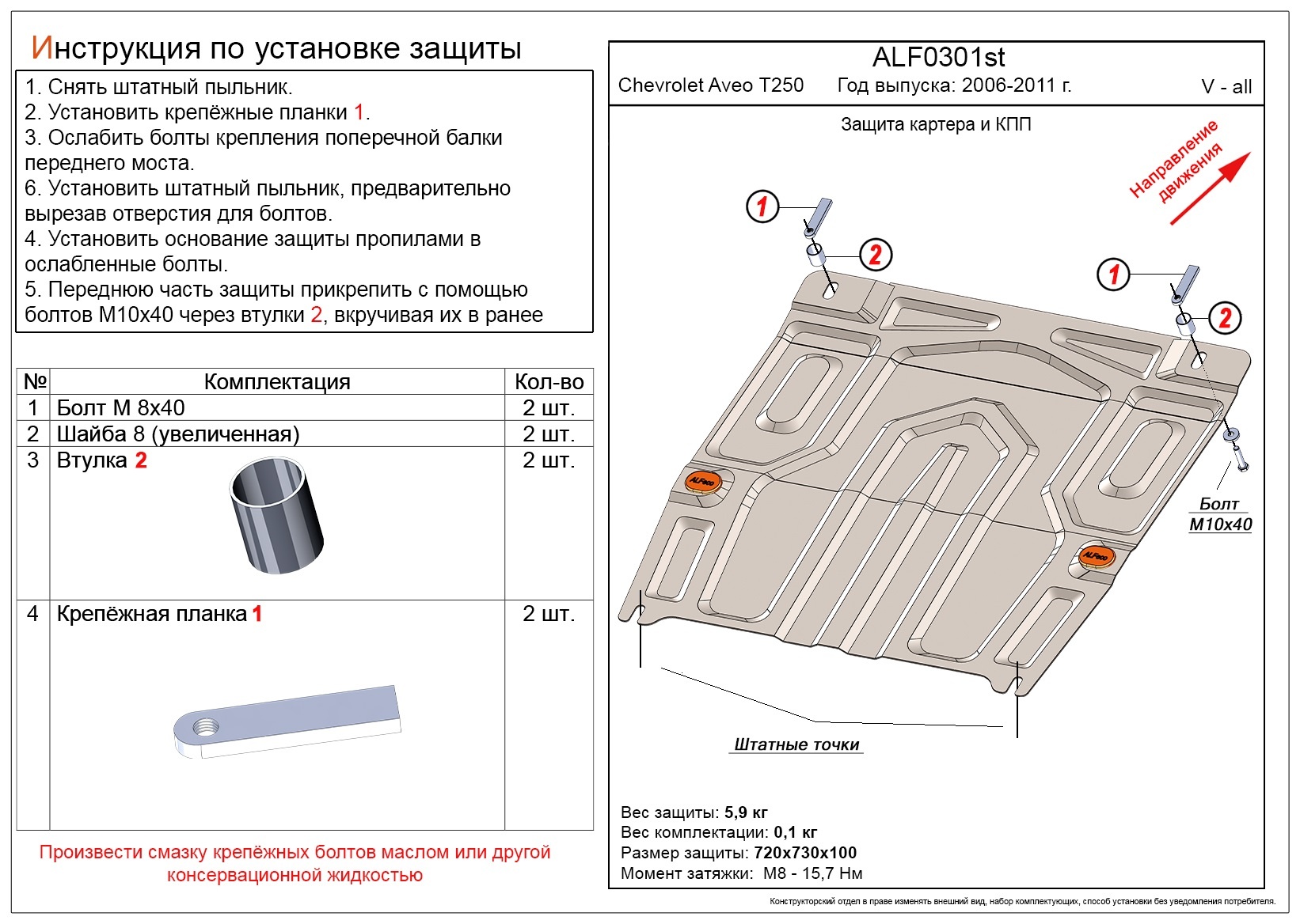- Защита картера и КПП (малая) для Chevrolet Aveo I Рестайлинг совместим и проверен на практике — установка без доработок.