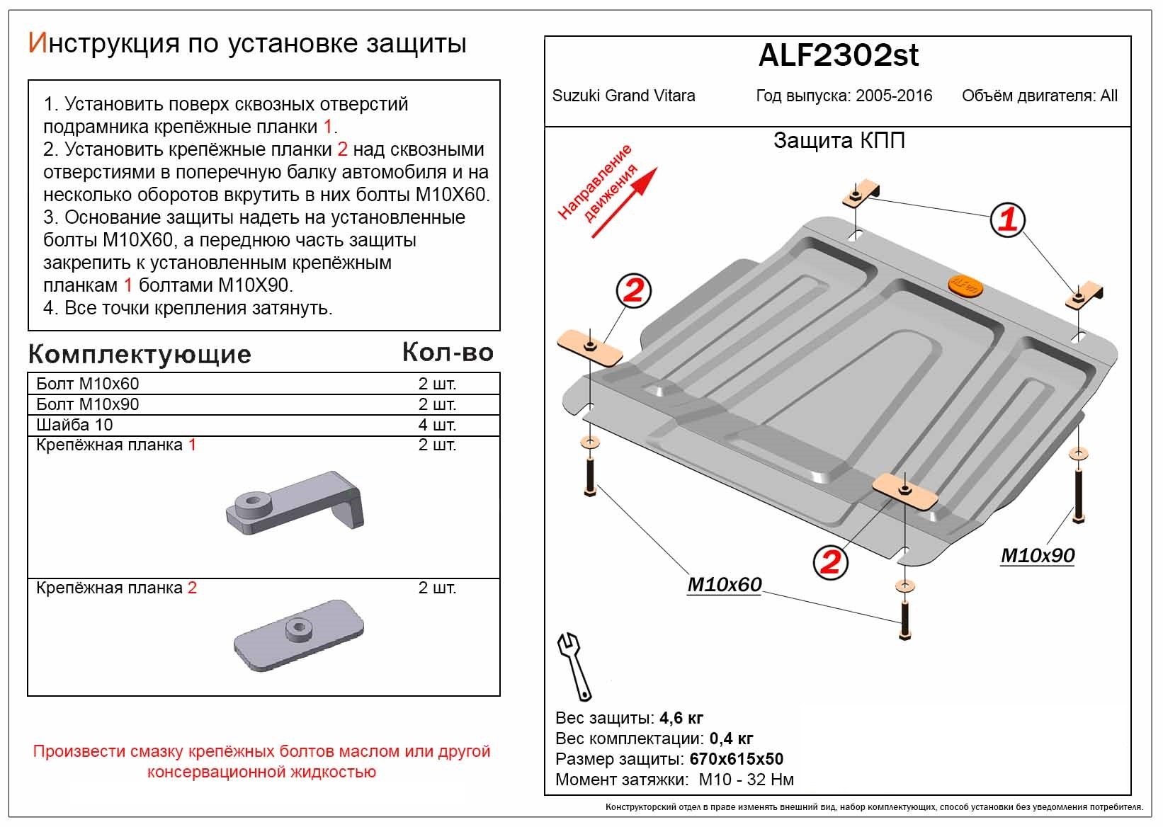 - Защита КПП для Suzuki Grand Vitara III Alfeco ALF2302AL совместим и проверен на практике — установка без доработок.