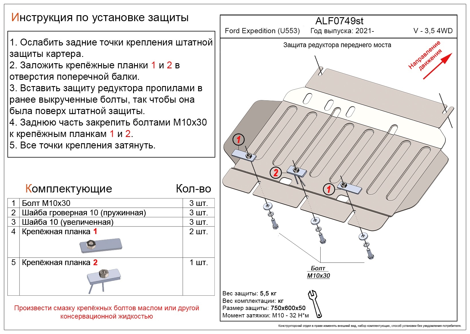 - Защита редуктора переднего моста для Ford Expedition IV Рестайлинг Alfeco ALF0749AL совместим и проверен на практике — установка без доработок.
