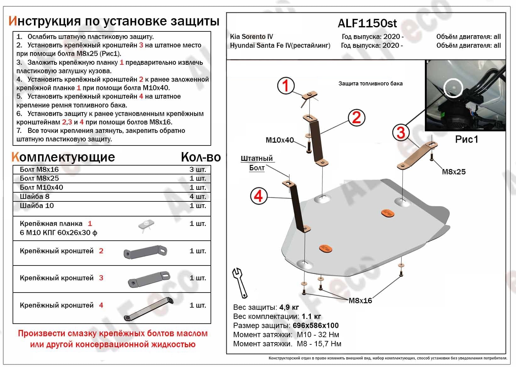 - Защита топливного бака для Kia Sorento IV Alfeco ALF1150AL совместим и проверен на практике — установка без доработок.