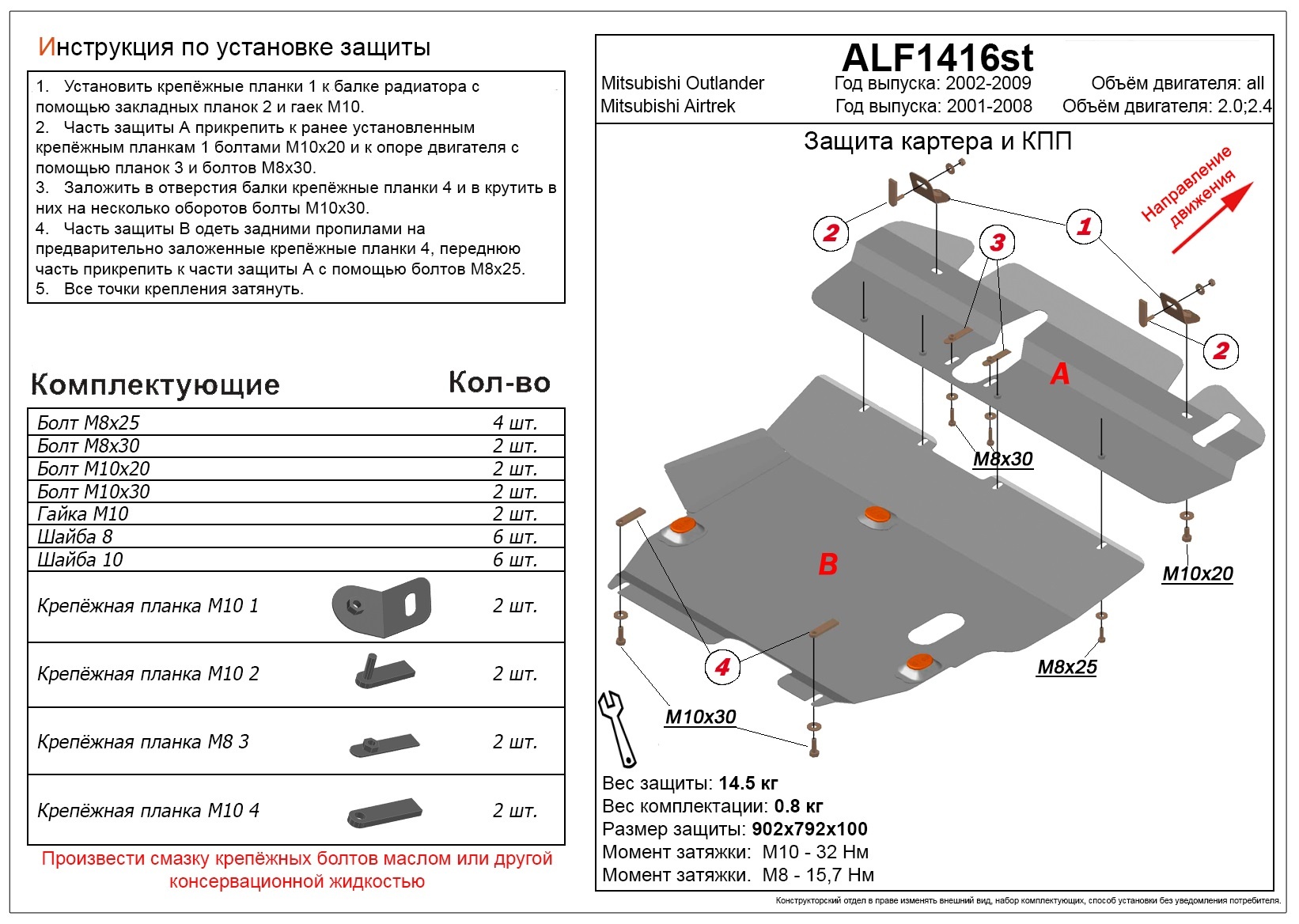 - Предоставляется гарантия на защита картера и кпп (2 части) для mitsubishi outlander ii: в случае брака оформим возврат средств в течение 7 дней.