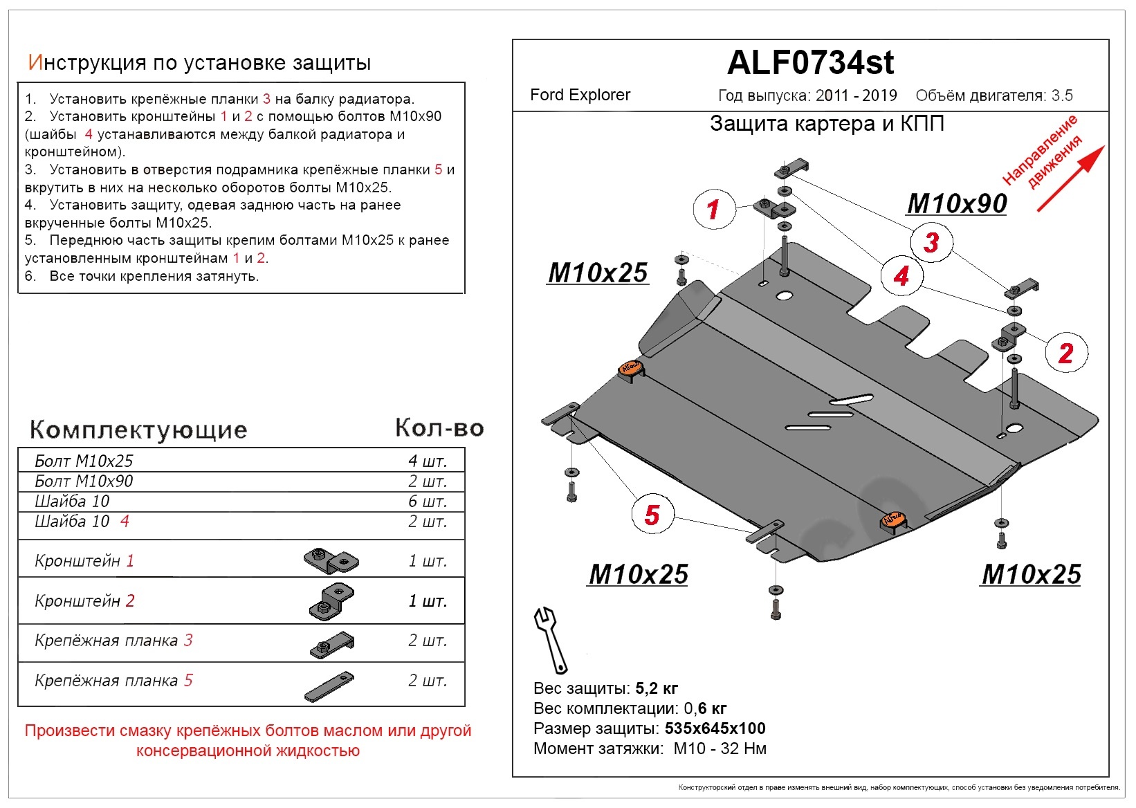- Защита картера и КПП для Ford Explorer V Рестайлинг 2 Черный можно установить самостоятельно или на любом СТО без проблем.