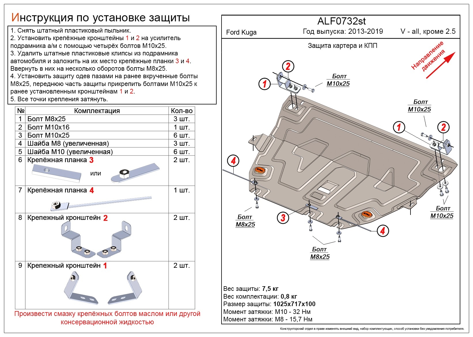 - Защита картера и КПП для Ford Kuga II Рестайлинг Черный можно установить самостоятельно или на любом СТО без проблем.