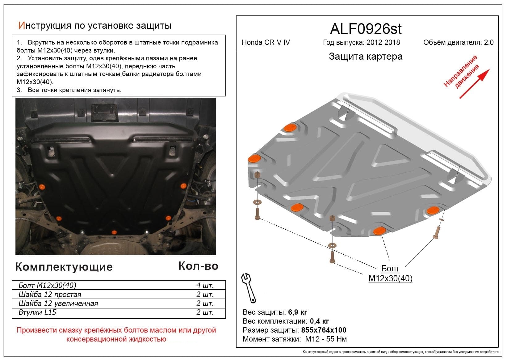 - Защита картера и КПП для Honda CR-V IV Рестайлинг Черный Alfeco ALF0926AL4 совместим и проверен на практике — установка без доработок.