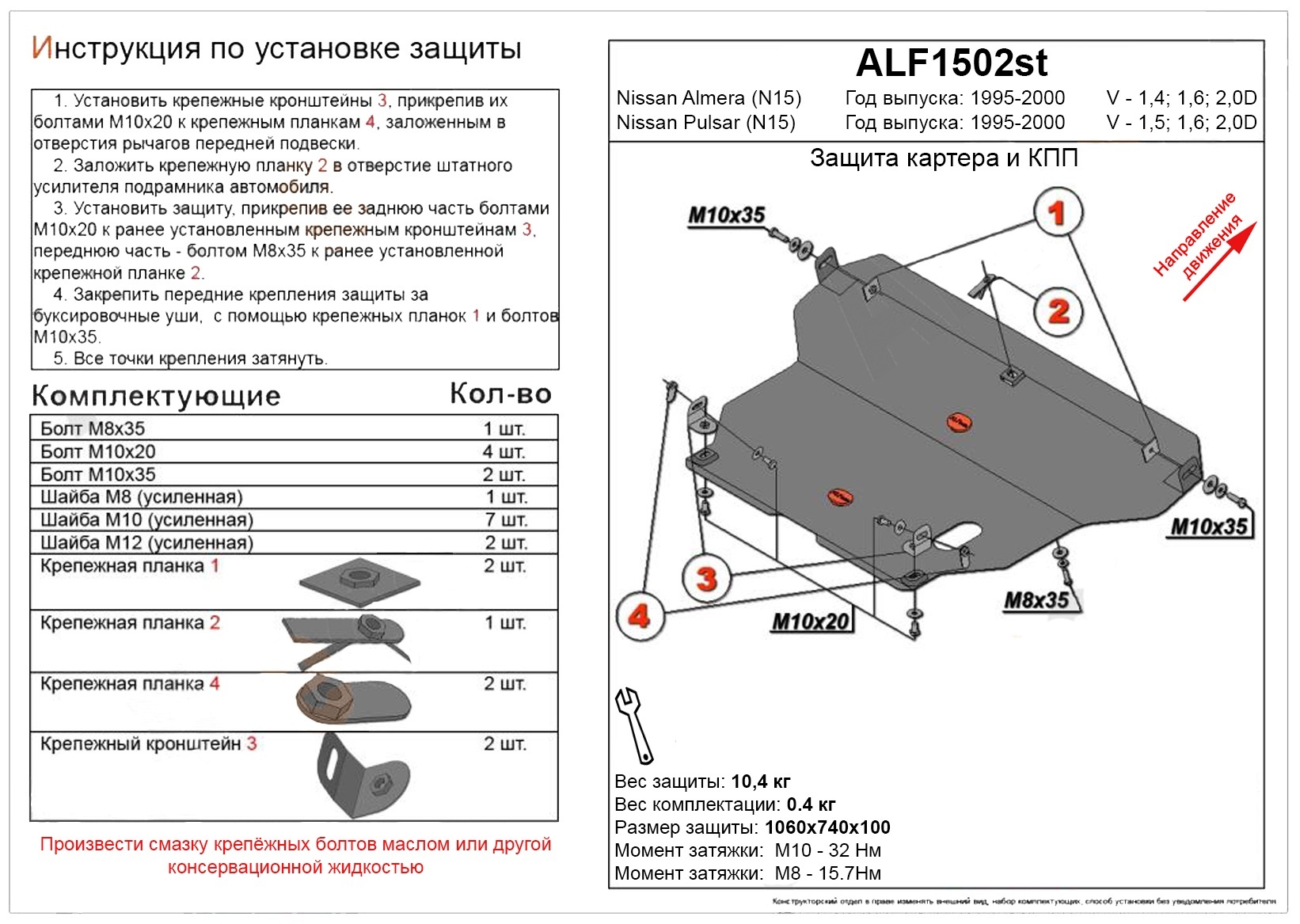- Защита картера и КПП для Nissan Almera I (N15) Alfeco ALF1502AL4 совместим и проверен на практике — установка без доработок.