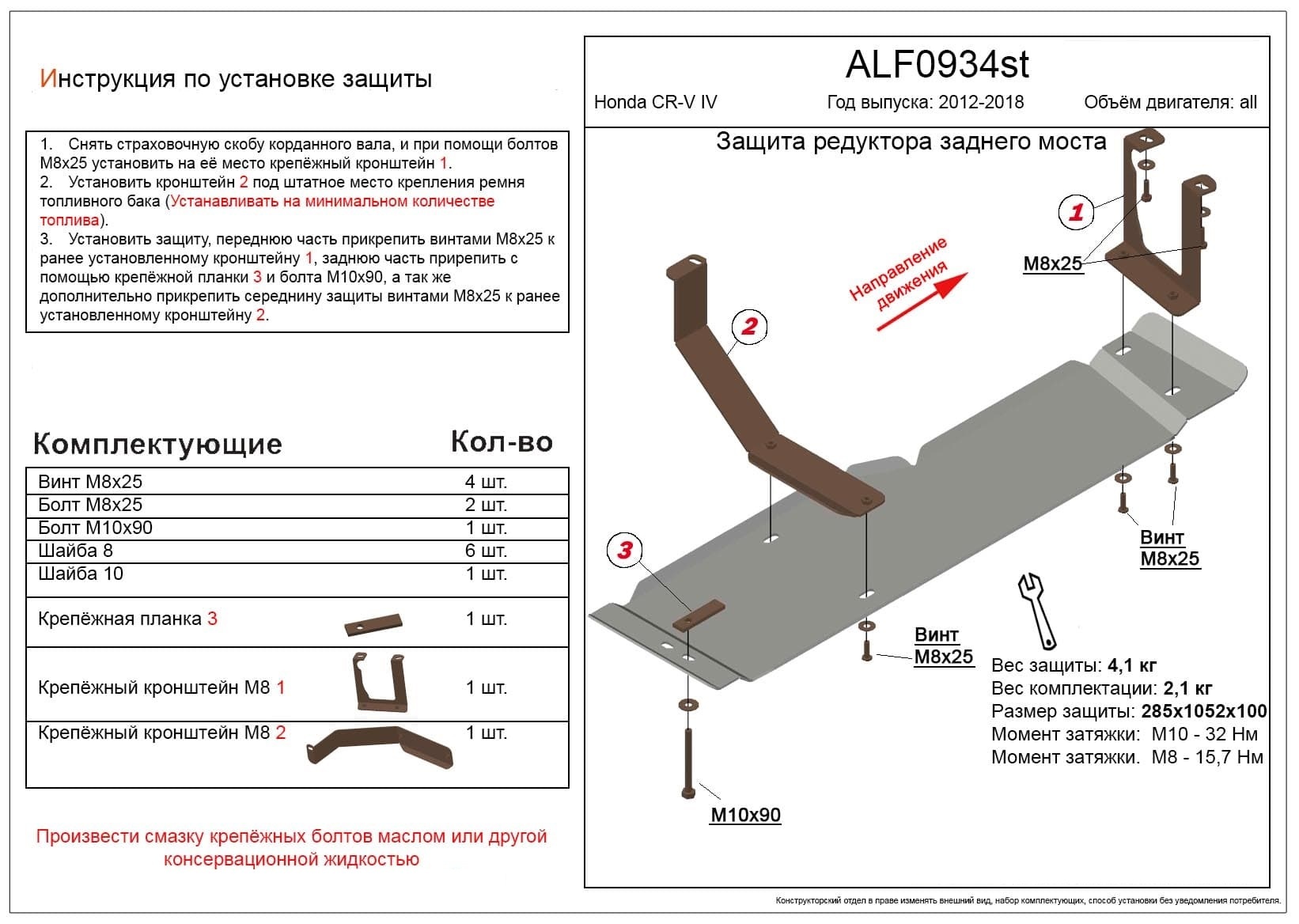 - Защита редуктора заднего моста для Honda CR-V IV Рестайлинг Alfeco ALF0934AL4 совместим и проверен на практике — установка без доработок.