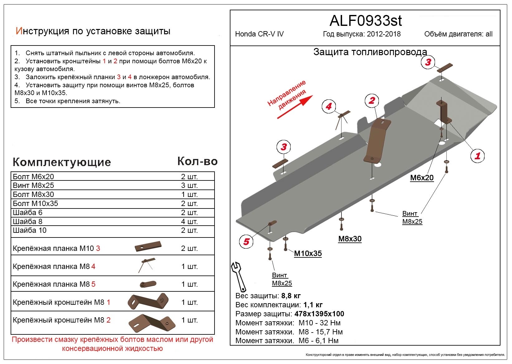 - Защита топливопровода для Honda CR-V IV Рестайлинг Черный можно установить самостоятельно или на любом СТО без проблем.